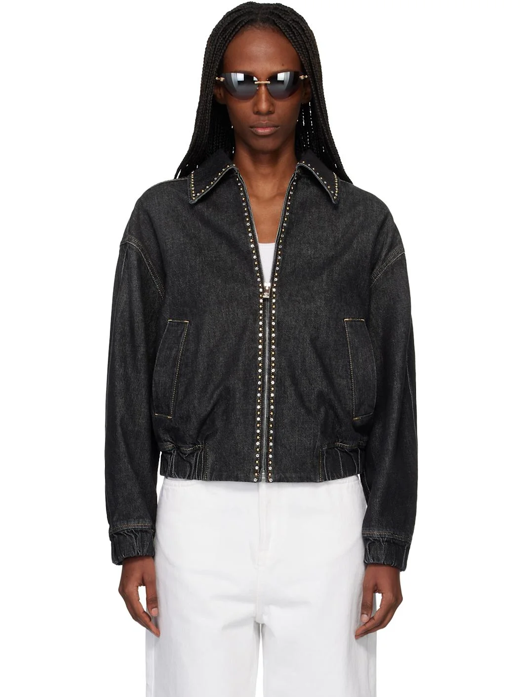 Non-stretch denim jacket. · Fading, studs, and rhinestones throughout · Spread collar · Zip closure · Welt pockets at front · Elasticized hem and cuffs · Dropped shoulders · Logo patch at back · Full satin lining · Contrast stitching in tan · Supplier color: Black Body: 100% cotton. Lining: 68% acetate, 32% polyester. Made in Italy 261404F060000