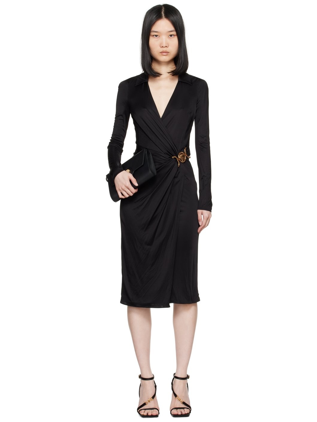 Viscose jersey dress. · Wrap construction · Plunging spread collar · Gathering and logo hardware at front · Concealed zip closure at side seam · Vented hem Supplier color: Black 100% viscose. Made in Italy 242404F054003