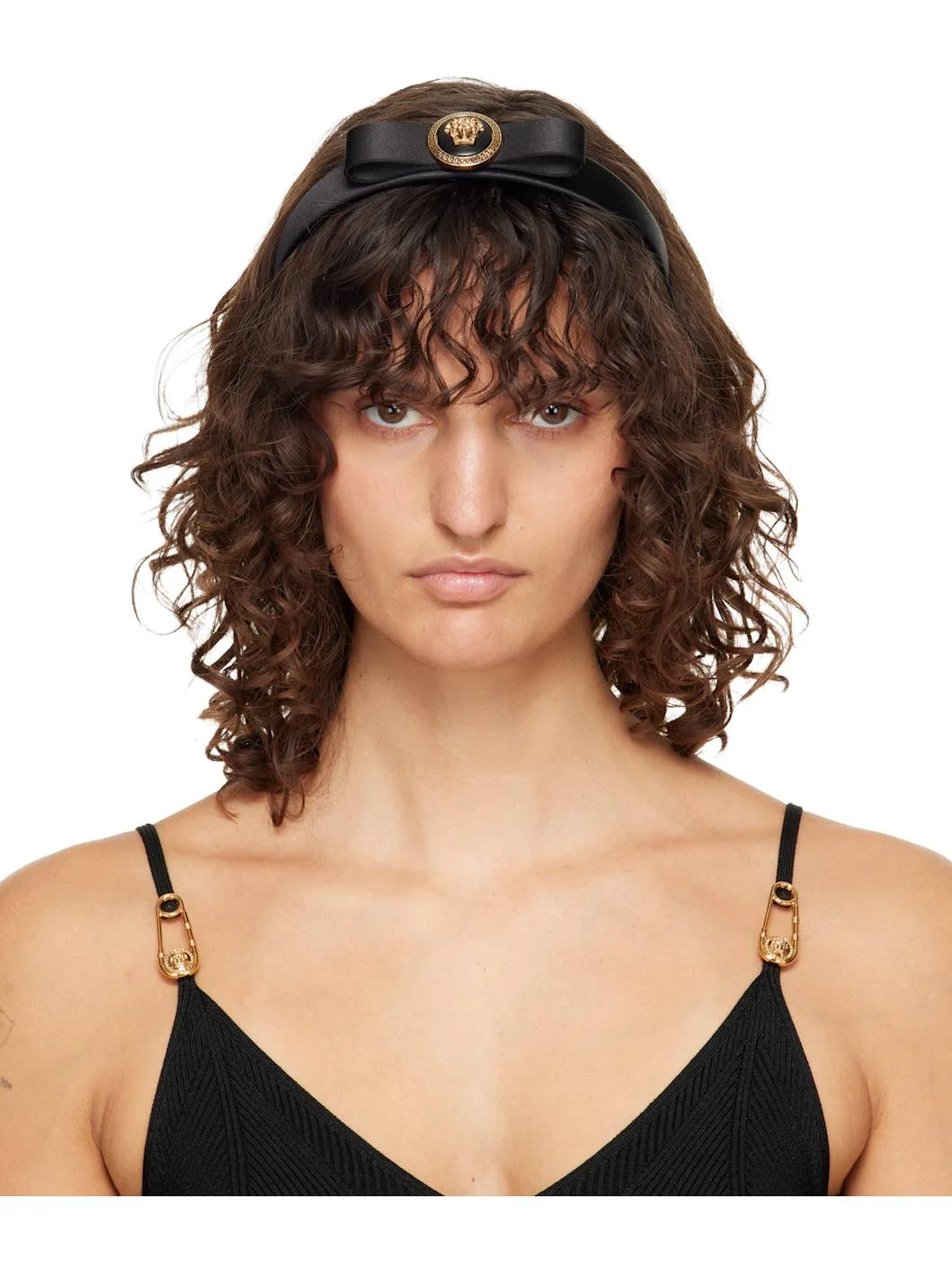 Satin headband. · Bow with logo hardware at face · Grosgrain trim at interior · D5.25" Supplier color: Black Textile. Made in Italy 261404F018002