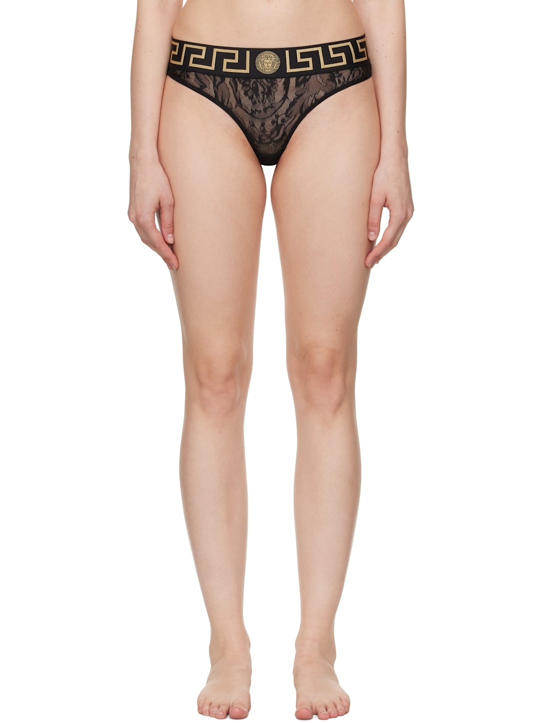 Sheer stretch nylon lace briefs. · Embroidered floral pattern throughout · Elasticized waistband with logo pattern · Unlined Supplier color: Black 82% nylon, 18% elastane. Made in Italy 252404F074000