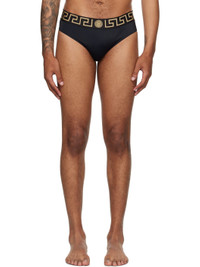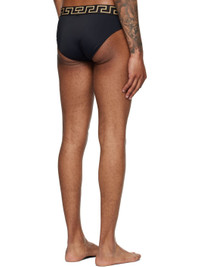 Stretch nylon jersey swim briefs. · Medusa and Greek key pattern at elasticized waistband · Dart at front · Full stretch jersey lining Supplier color: Black Body: 78% nylon, 22% elastane. Trim: 82% polyester, 9% nylon, 9% elastane. Lining: 88% polyester, 12% elastane. Made in Italy 252404M208003