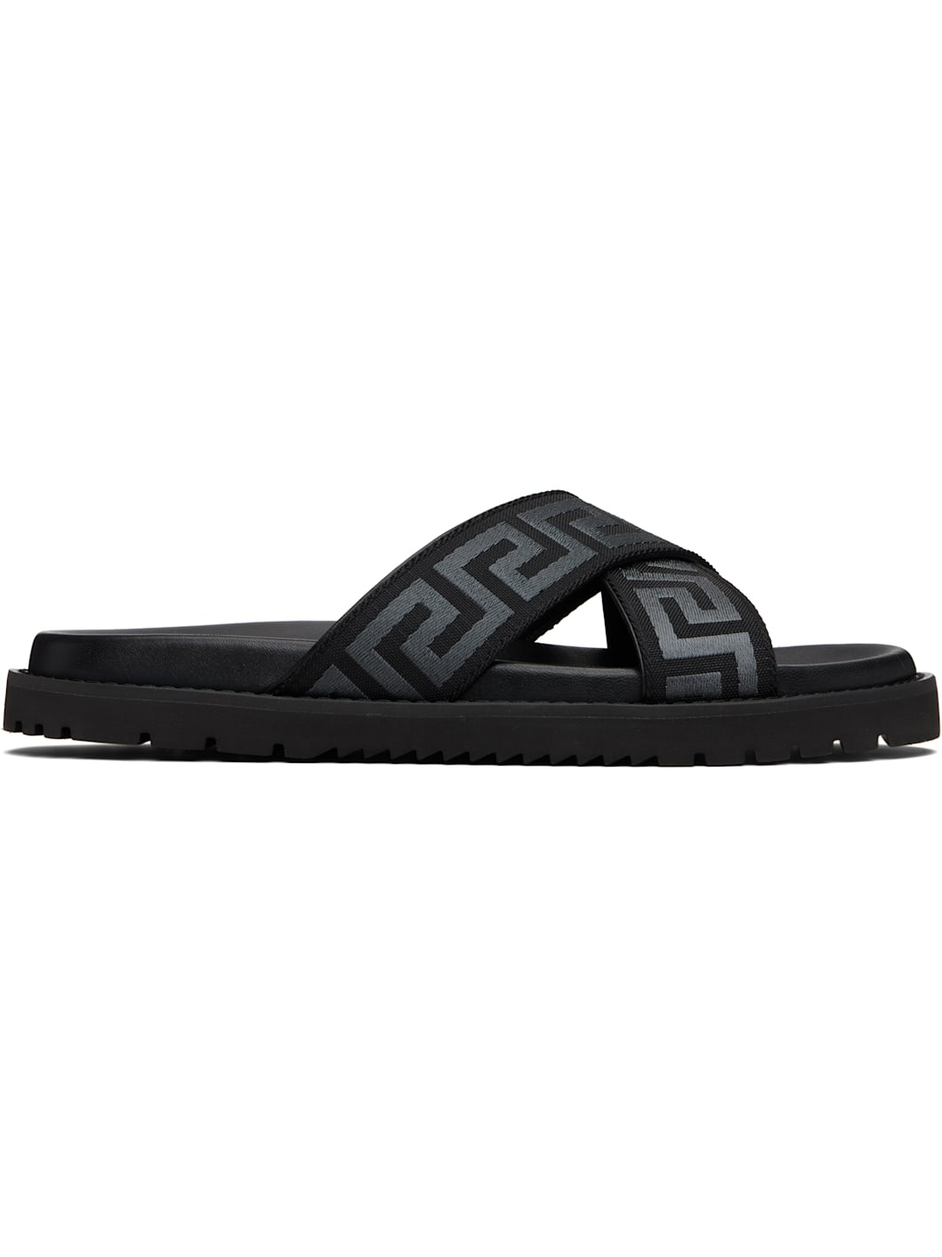 Webbing slides. · Open toe · Jacquard Greek key pattern at crisscrossing straps · Logo-embossed molded lambskin footbed · Treaded rubber sole Supplier color: Black/Anthracite Upper: textile, lambskin. Sole: rubber. Made in Spain 252404M234000