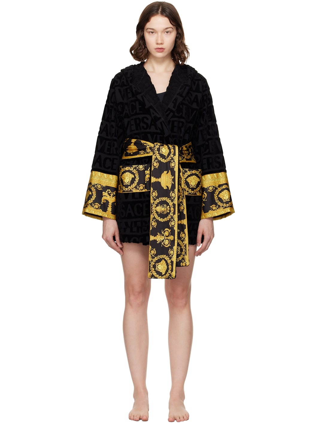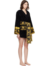 Cotton terrycloth bathrobe. Jacquard logo pattern and Barocco-patterned poplin trim throughout. · Shawl collar · Belt loops with detachable self-tie belt · Patch pockets at waist Supplier color: Black 100% cotton. Made in Italy 252404F077011