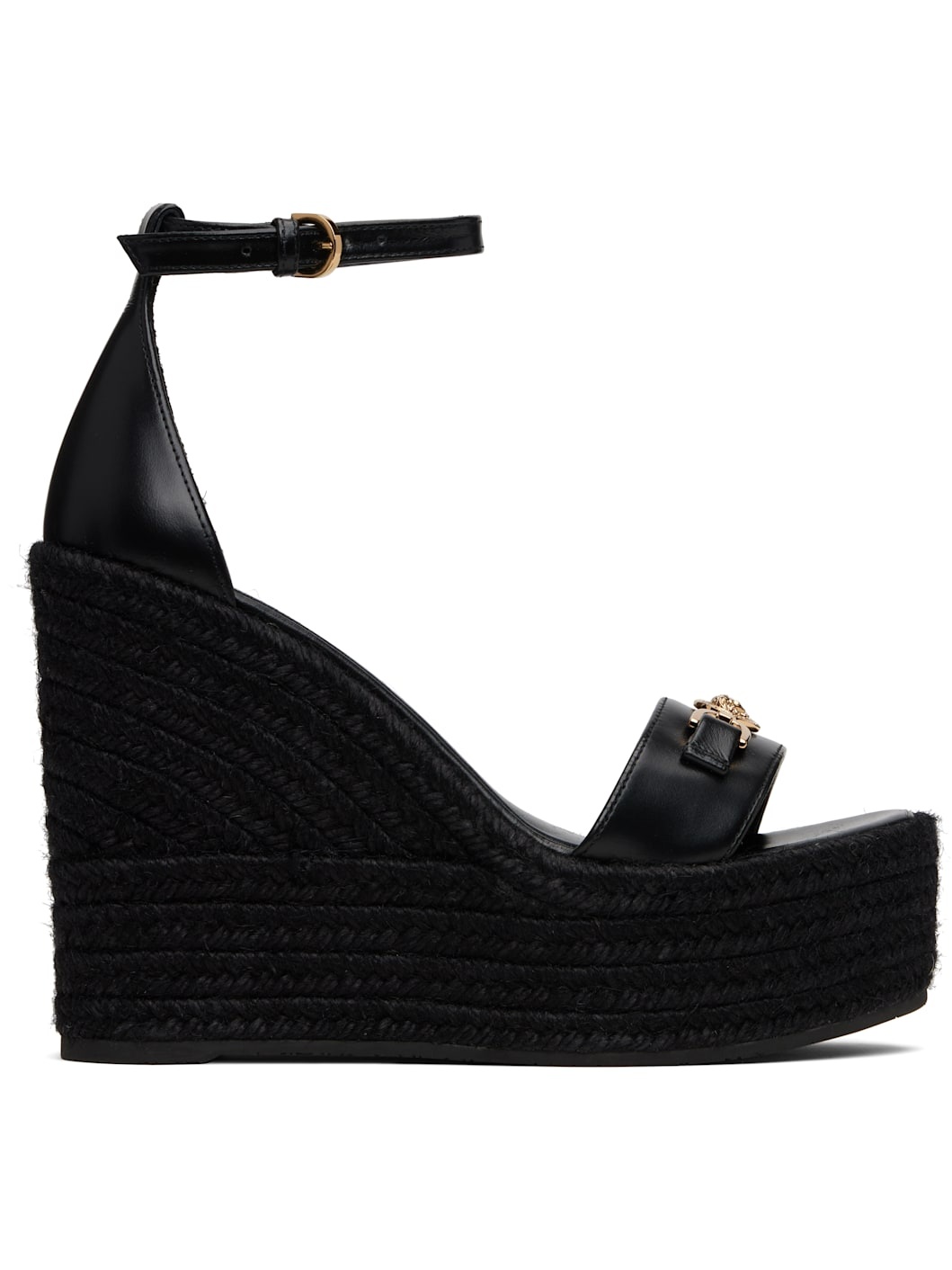Buffed lambskin heeled sandals. · Open toe · Medusa hardware at vamp · Pin-buckle ankle strap · Logo printed at footbed · Braided raffia-covered wedge heel and midsole · Platform midsole · Treaded rubber sole · Platform: H1.75" · Heel: H4.5" Supplier color: Black/Gold Upper: lambskin. Sole: raffia, rubber. Made in Spain 252404F125003