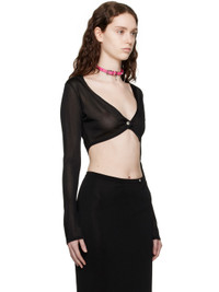 Semi-sheer knit viscose cardigan. Rib knit trim throughout. · Plunging V-neck · Single-button closure · Cropped hem · Logo-engraved silver-tone hardware Supplier color: Black 100% viscose. Made in Italy 231404F095005