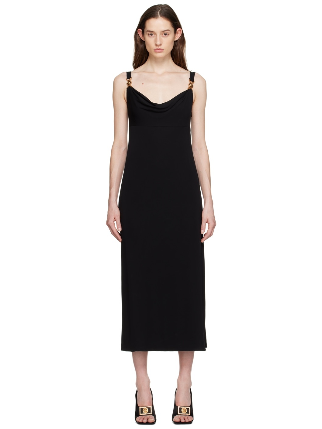 Stretch viscose jersey dress. · Cowl neck · Zip closure at side seam · Vented side seam · Medusa hardware at fixed shoulder straps · Fully lined Supplier color: Black Body: 95% viscose, 5% elastane. Lining: 95% viscose, 5% elastane. Made in Italy 231404F055001