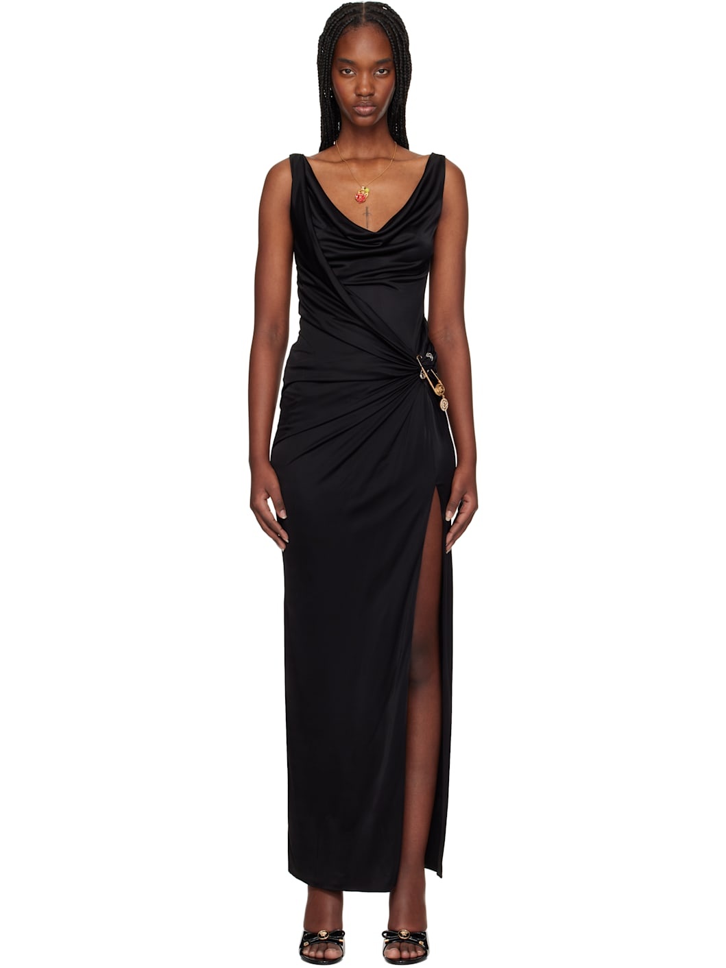 Viscose jersey maxi dress. Gathering throughout. · Plunging cowl neck · Gathering and Medusa safety pins at side seam · Zip closure at side seam · Slit at side seam · Full viscose jersey lining Supplier color: Black Body: 100% viscose. Lining: 100% viscose. Made in Italy 251404F055002