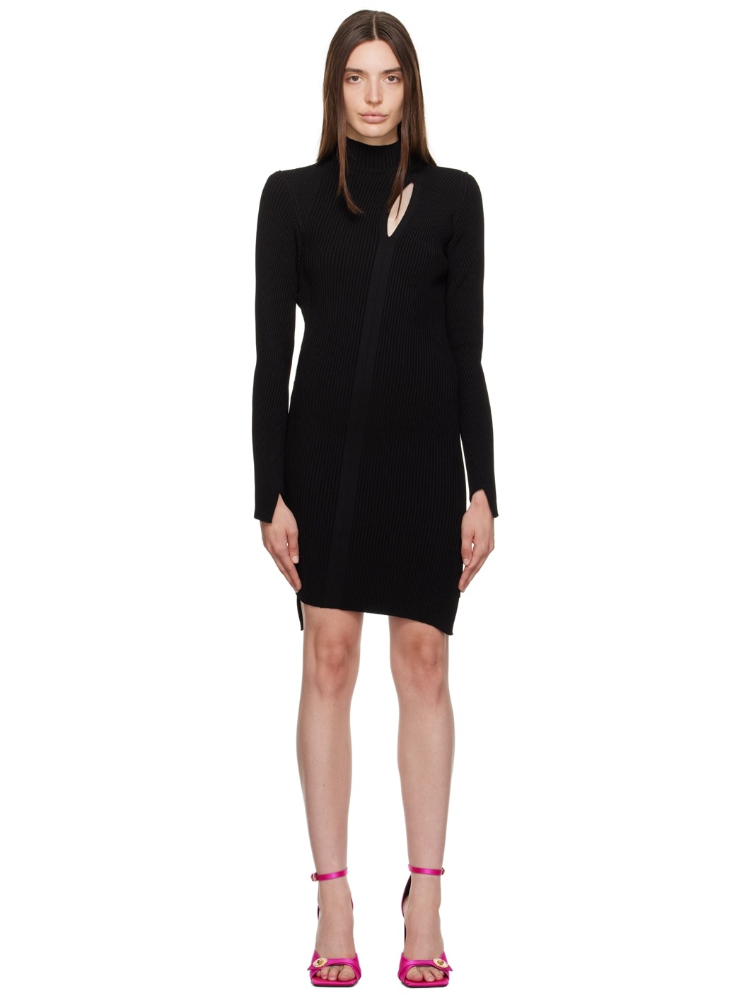 Rib knit viscose-blend dress. · Mock neck · Cutout at chest · Asymmetric hem and cuffs · Logo hardware at back collar Supplier color: Black 88% viscose, 12% polyester. Made in Italy 232404F052004
