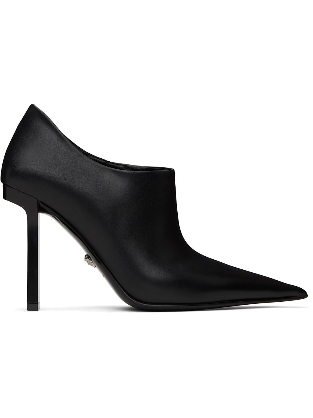 Ankle-high buffed calfskin boots in black. · Pointed toe · Concealed elasticized gusset at inner side · Logo embossed at heel · Buffed lambskin lining · Lacquered block heel with rubber injection · Signature Medusa hardware at calfskin sole · Heel: H4" Supplier color: Black Upper: calfskin. Sole: calfskin, rubber. Made in Italy 242404F122020