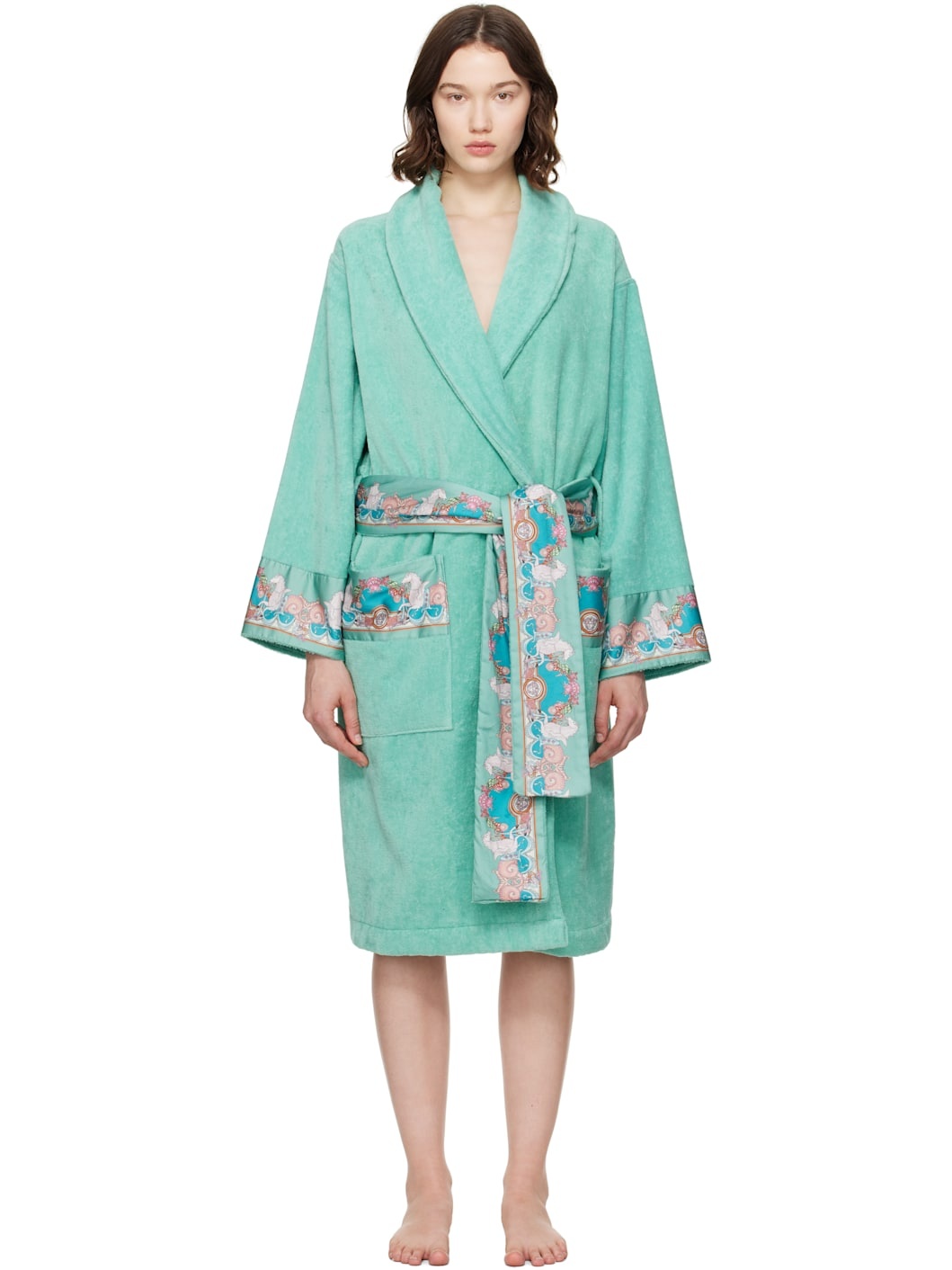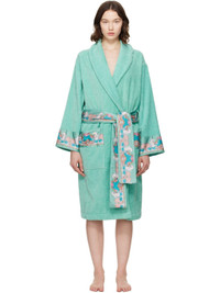 Cotton terrycloth bathrobe. Graphic-patterned poplin trim throughout. · Shawl collar · Belt loops with detachable self-tie belt · Patch pockets at waist Part of the La Vacanza collection. Supplier color: Green+Blue 100% cotton. Made in Italy 252404F077000