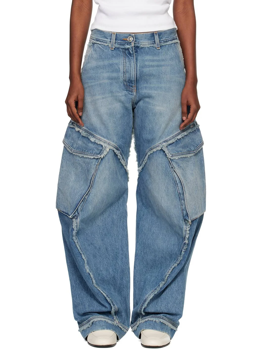 Non-stretch denim jeans. · Fading, whiskering, and frayed edges throughout · Low-rise · Belt loops · Four-pocket styling · Cargo pocket at outseams · Logo patch at back waistband · Contrast stitching in tan Supplier color: Medium blue 100% cotton. Made in Italy 261404F069001