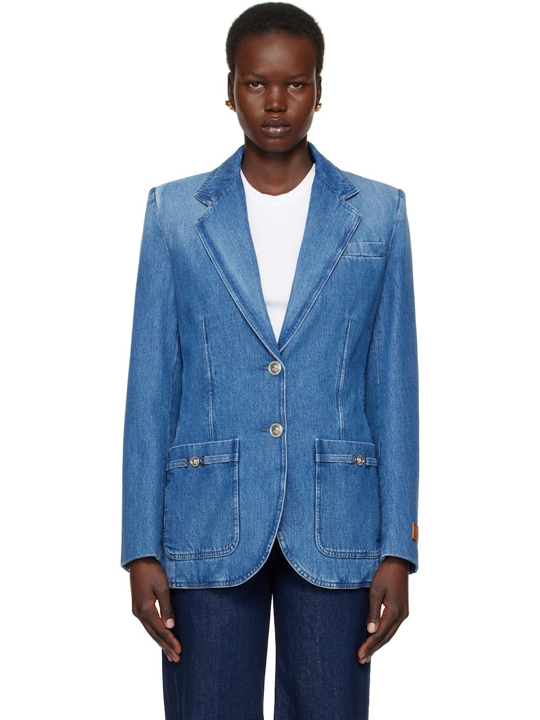 Stonewashed non-stretch denim blazer. Fading throughout. · Notched lapel · Button closure · Welt pocket at chest · Medusa hardware at patch pockets · Padded shoulders · Logo patch at cuff · Three-button surgeon's cuffs · Central vent at back hem · Partial jacquard Barocco satin lining · Logo-engraved silver-tone hardware Supplier color: Blue Body: 100% cotton. Lining: 58% cupro, 42% viscose. Made in Italy 242404F057000