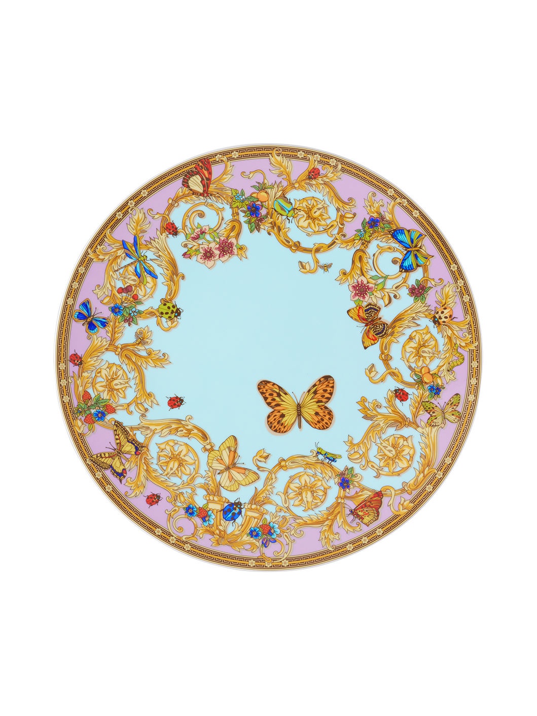 Glazed porcelain serving plate in blue. Heritage Butterflies & Ladybugs graphics throughout. H3.2 x D33.1 cm Part of the limited edition Rosenthal meets Versace collection. Supplier color: Le Jardin de Versace