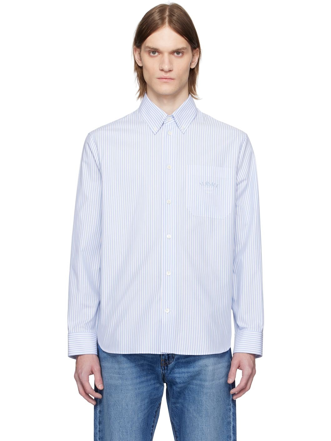 Cotton poplin shirt. Stripe pattern throughout. · Button-down spread collar · Button closure · Logo and text embroidered at patch pocket · Shirttail hem · Buttoned barrel cuffs · Logo graphic printed at silk poplin yoke Supplier color: Pastel blue Body: 100% cotton. Trim: 100% silk. Made in Italy 251404M192011