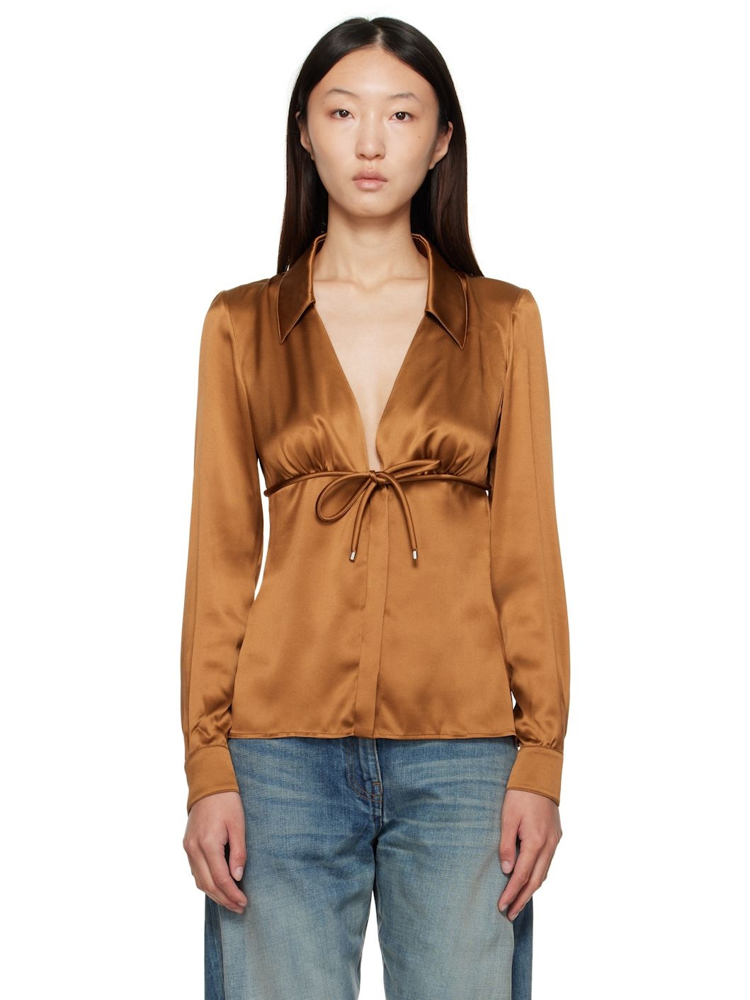 Silk satin shirt. · Spread collar · Plunging neck · Concealed button closure · Gathering and self-tie fastening at chest · Buttoned barrel cuffs · Darts at back · Logo-engraved silver-tone hardware Supplier color: Tobacco 100% silk. Made in Italy 251404F109002