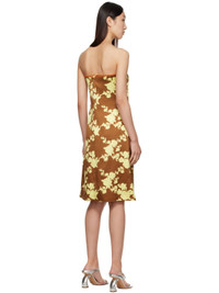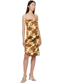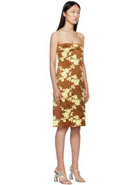Silk satin midi dress. · Floral pattern throughout · Strapless construction · Scalloped trim at straight neck · Gathering at chest · Concealed zip closure at back · Integrated corset at interior Supplier color: Brown/Yellow Body: 100% silk. Trim: 100% silk. Lining: 92% silk, 8% elastane. Made in Italy 251404F054006