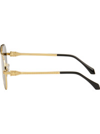 Aviator-style metal-frame sunglasses. · Gray lenses · Logo etched at lens · 100% UVA/UVB protection, category 3 · Double bridge · Adjustable rubber nose pads · Logo hardware at face and temples · Graphic engraved at temples · Black acetate trim at temple tips · Includes case · Size: 61.13 140 Supplier color: Gold Metal, acetate. Made in Italy 252404F005019