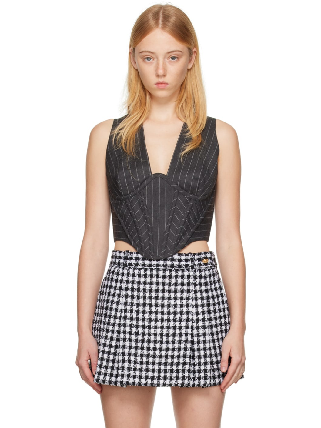 Wool twill corset. Stripes and boning throughout. · Plunging V-neck · Zip closure at back · Full acetate and silk-blend satin lining Supplier color: Medium grey Body: 100% wool. Lining: 75% acetate, 25% silk. Made in Italy 222404F368005