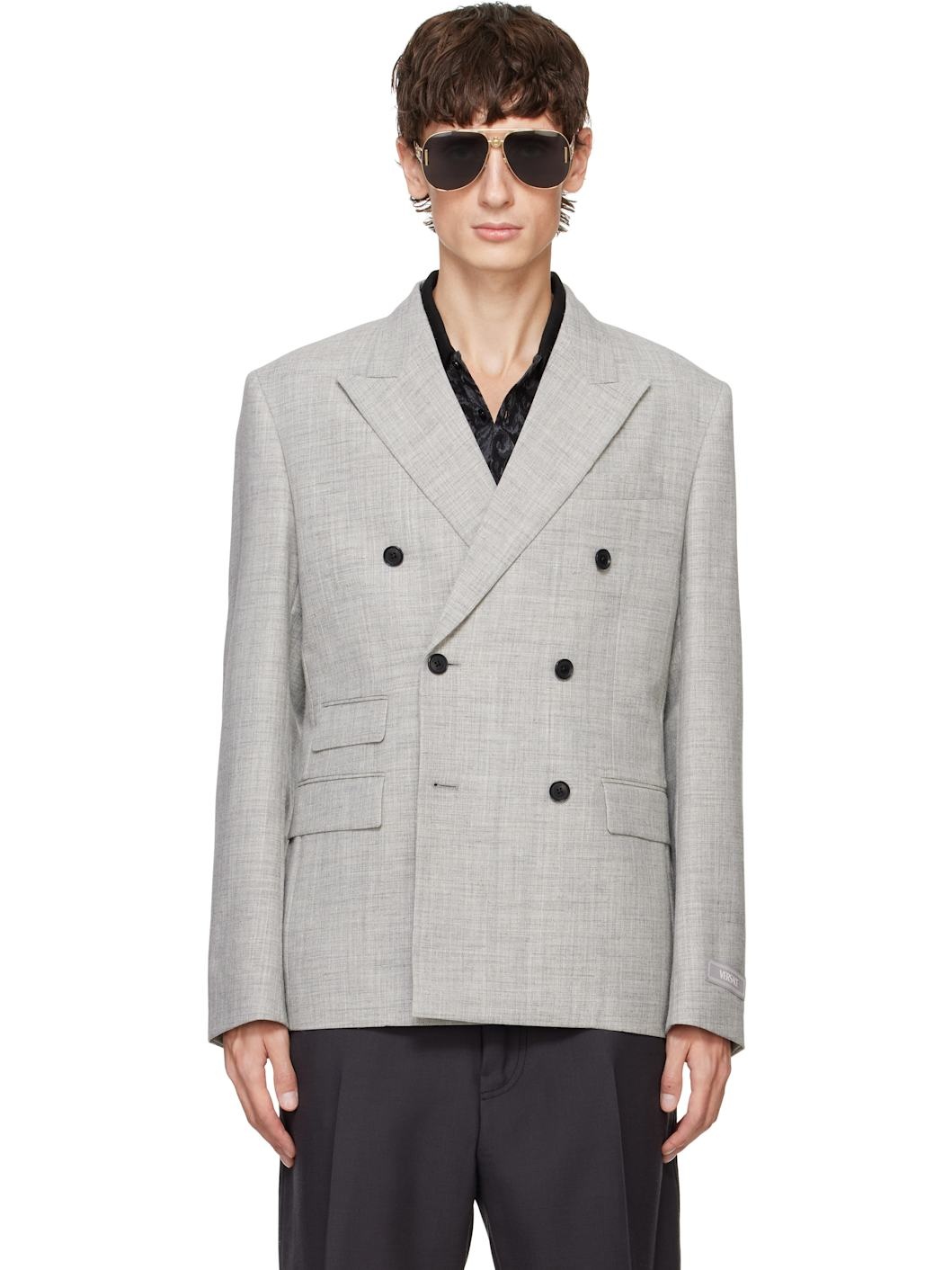 Virgin wool-blend hopsack blazer. · Peaked lapel · Double-breasted button closure · Welt pocket and flap pockets at front · Padded shoulders · Three-button surgeon's cuffs · Vent at back hem · Welt pockets at interior · Partial silk satin lining Supplier color: Gray Body: 49% virgin wool, 24% wool, 18% viscose, 9% goat hair. Lining 1: 100% silk. Lining 2: 100% cupro. Lining 3: 100% cotton. Made in Italy 242404M195000