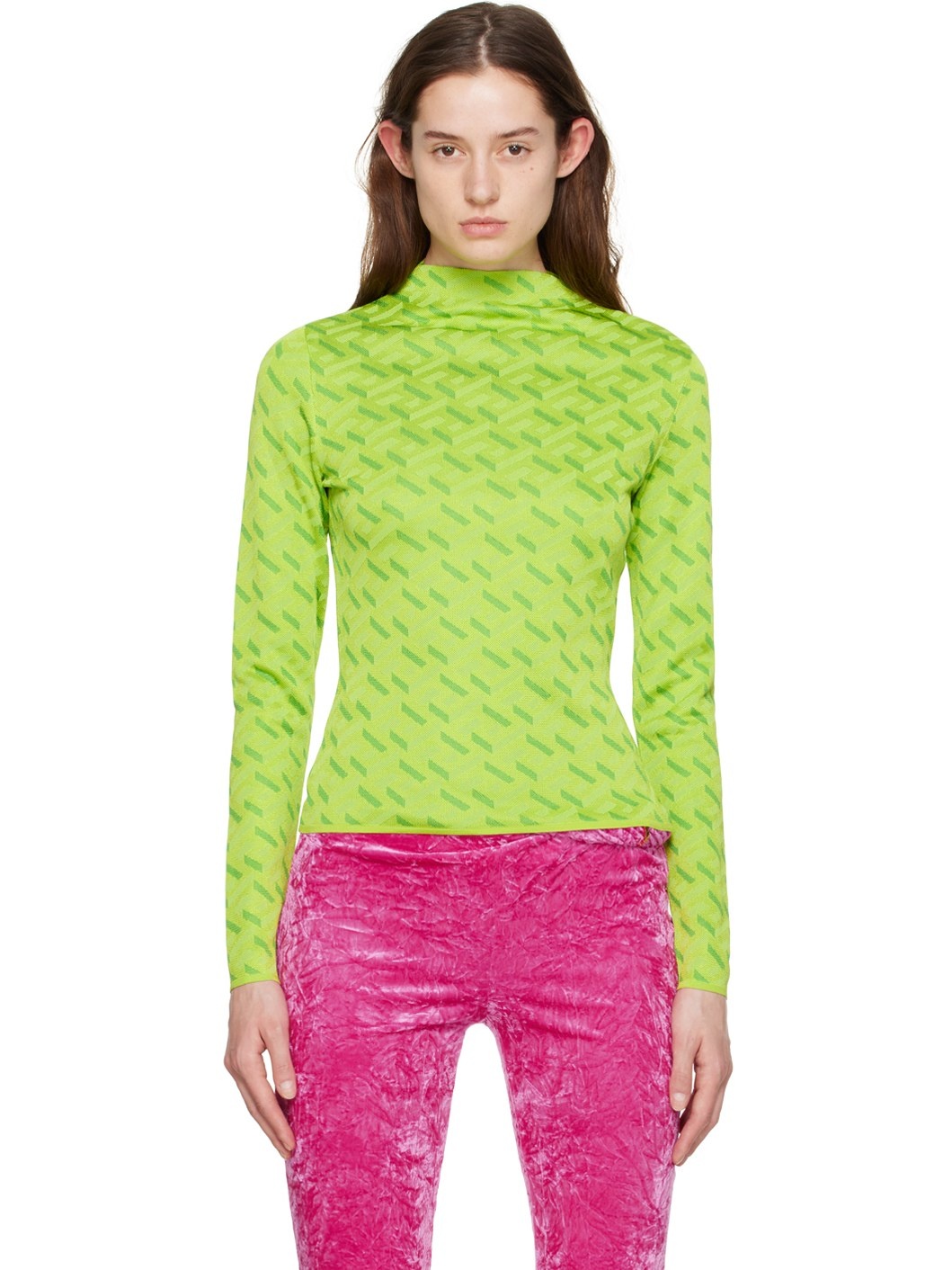 Knit silk-blend sweater. Jacquard Greek-key pattern throughout. · Mock neck · Rib knit hem and cuffs · Concealed zip closure at back Supplier color: Acid green/Green 56% silk, 43% viscose, 1% other fibres. Made in Italy 231404F099000