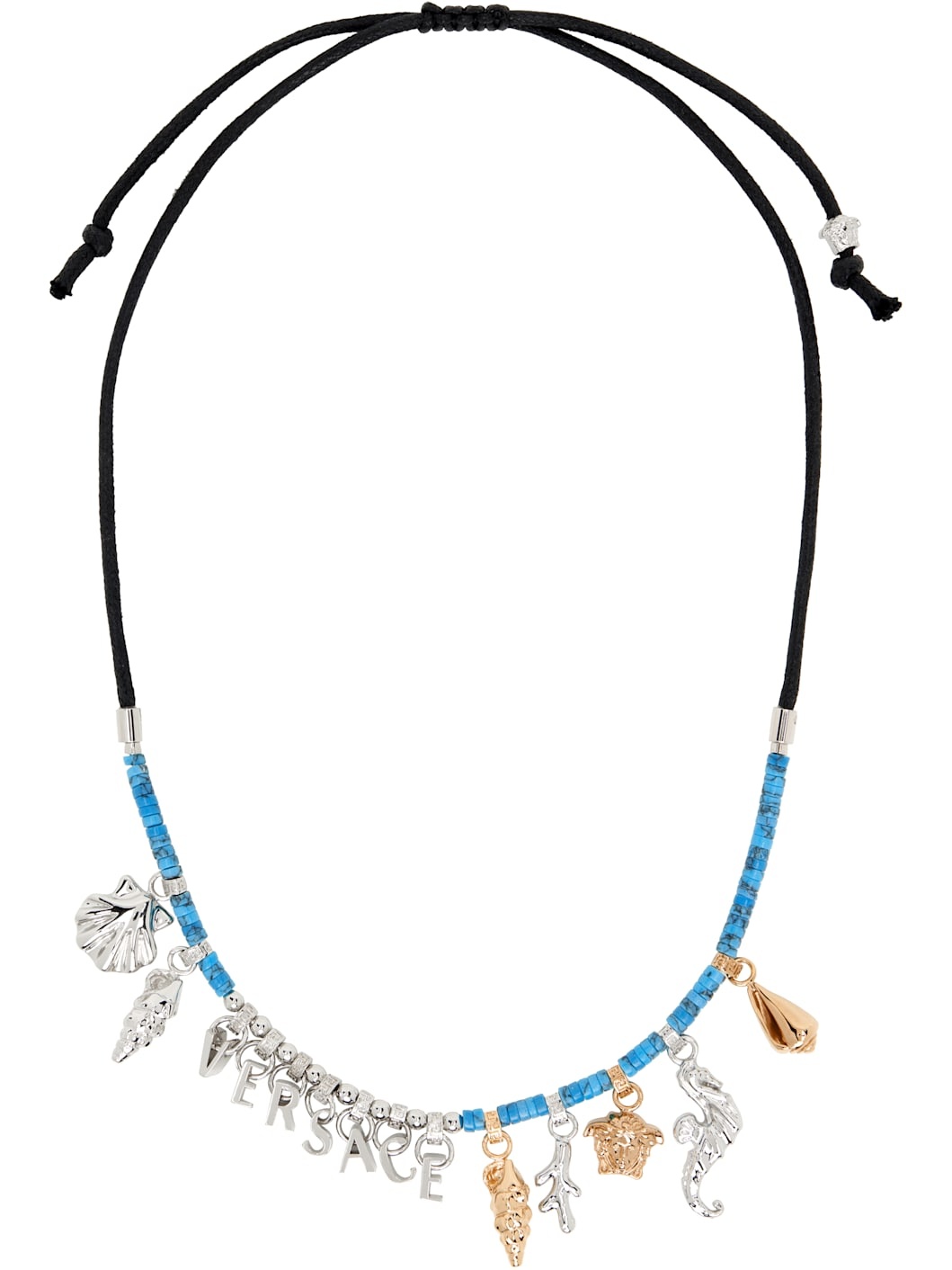 Beaded and waxed cotton cord necklace in blue and black. · Graphic and logo charms at length · Pull-through fastening · L17.75" Supplier color: Light blue/Gold Textile, metal. Made in Italy 252404F023000