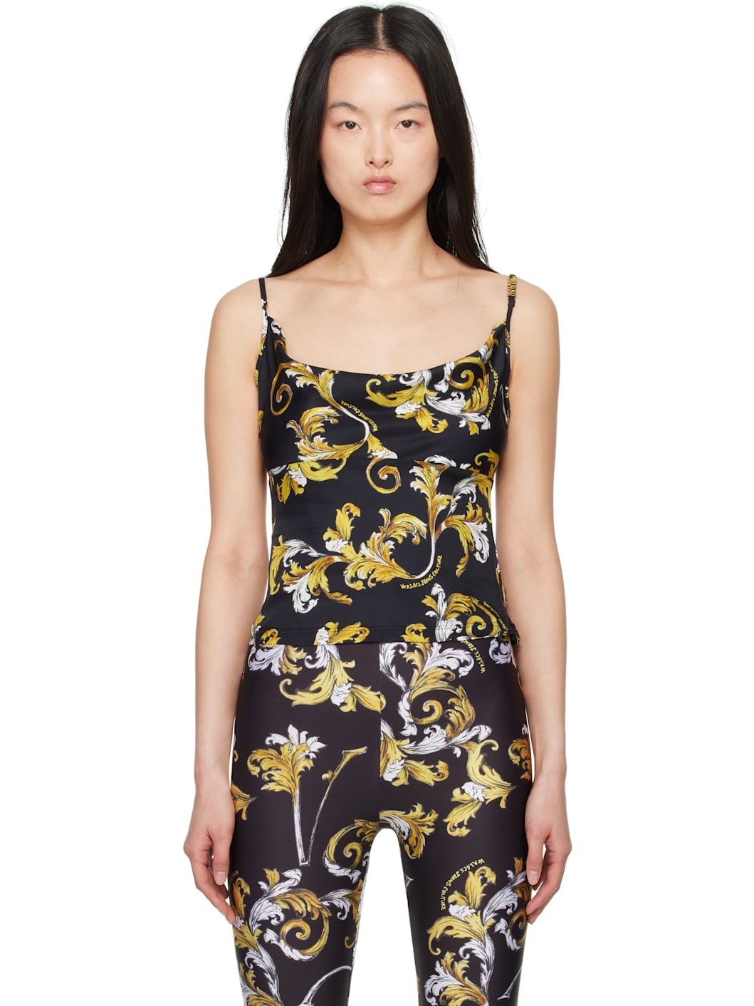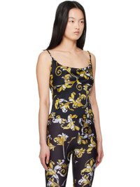 Viscose twill camisole. Barocco pattern and logos printed throughout. · Cowl neck · Logo hardware at adjustable spaghetti straps · Concealed zip closure at side seam Supplier color: Black/Gold 100% viscose. Made in Albania 251202F111004