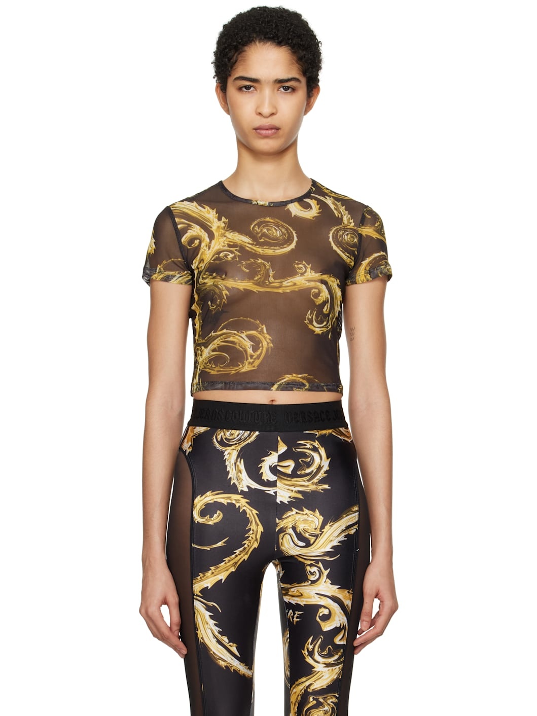 Sheer stretch polyester mesh T-shirt. Logo graphic pattern printed throughout. · Crewneck · Cropped hem Supplier color: Black/Gold 92% polyester, 8% elastane. Made in Albania 242202F110017