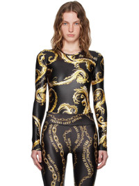 Stretch polyester jersey bodysuit. Graphic pattern and logos printed throughout. · Round neck · Press-stud closure at bottom · Unlined Supplier color: Black/Gold 80% polyester, 20% elastane. Made in Albania 242202F358007