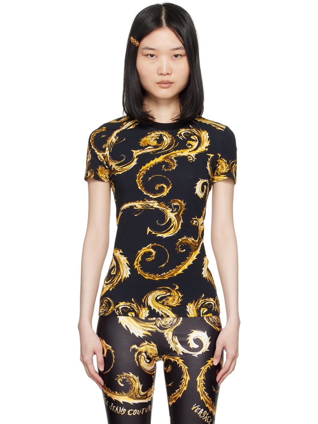 Cotton jersey T-shirt. · Graphic pattern and logo printed throughout · Rib knit crewneck Supplier color: Black/Gold 100% cotton. Made in Albania 242202F110006