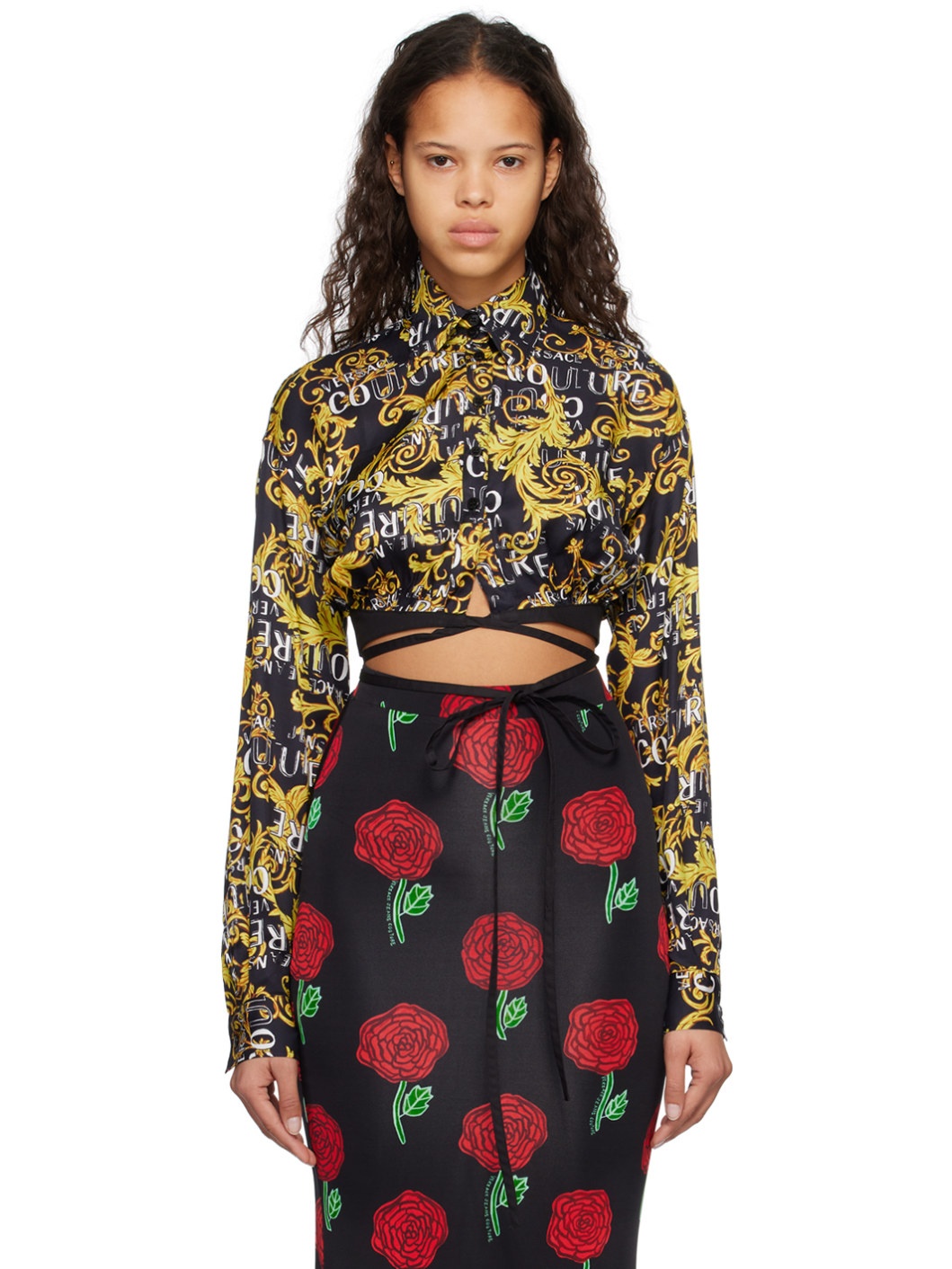 Viscose twill shirt. Graphic logo pattern printed throughout. · Spread collar · Button closure · Self-tie straps at cropped hem · Single-button barrel cuffs Supplier color: Black/Gold Body: 100% viscose. Lining: 100% cotton. Made in Albania 231202F109002