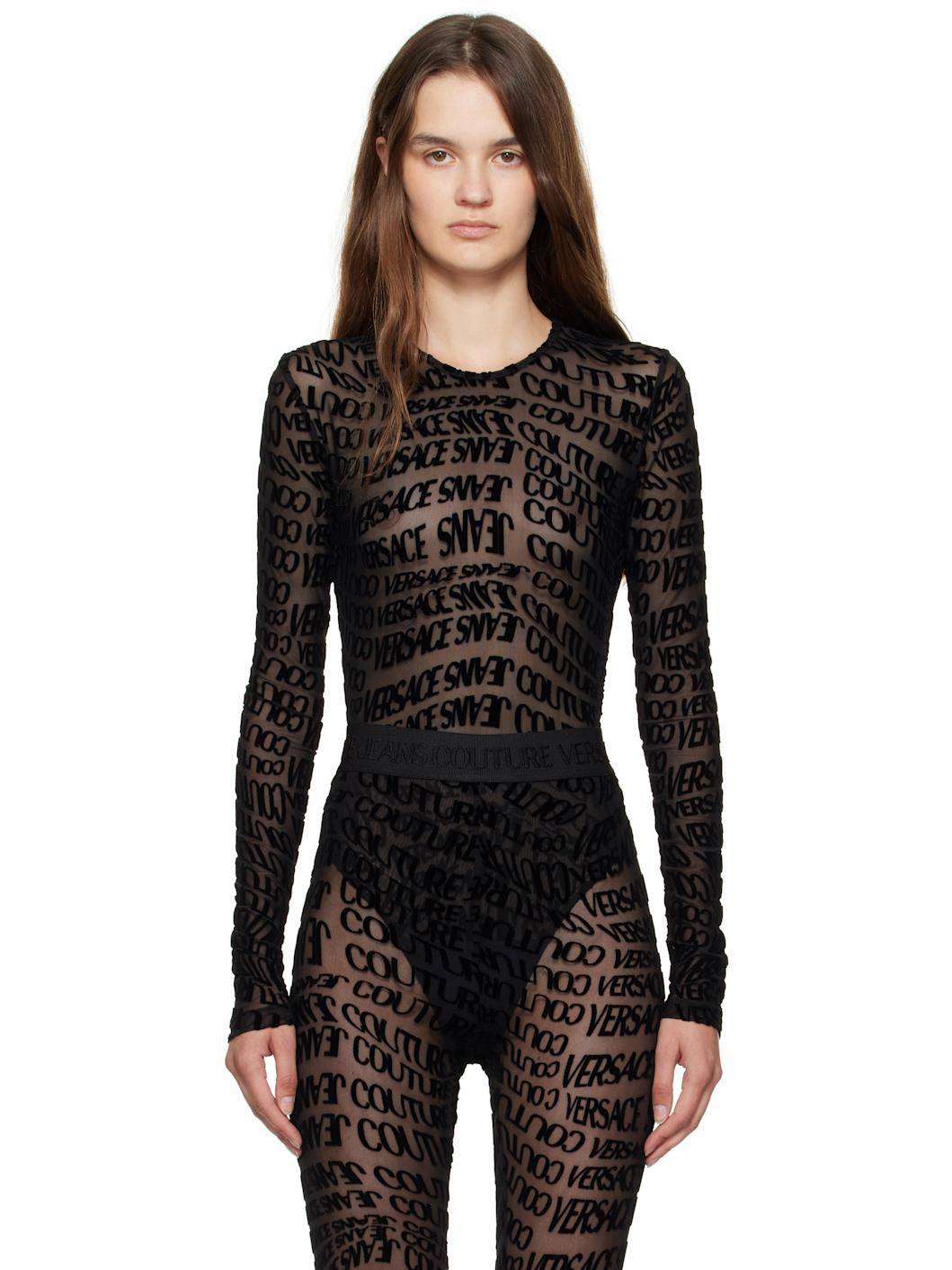 Sheer stretch mesh bodysuit. · Logo pattern flocked throughout · Crewneck · Satin bottom with adjustable press-stud fastening Supplier color: Black Body: 96% polyester, 4% elastane. Trim 1: 80% polyamide, 20% elastane. Trim 2: 100% polyamide. Made in Albania 252202F358002