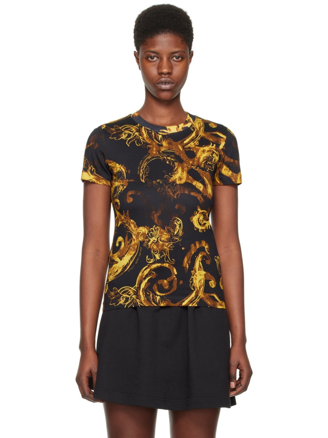 Cotton jersey T-shirt. · Logo and graphic pattern printed throughout · Rib knit crewneck Supplier color: Black/Gold 100% cotton. Made in Albania 241202F110002