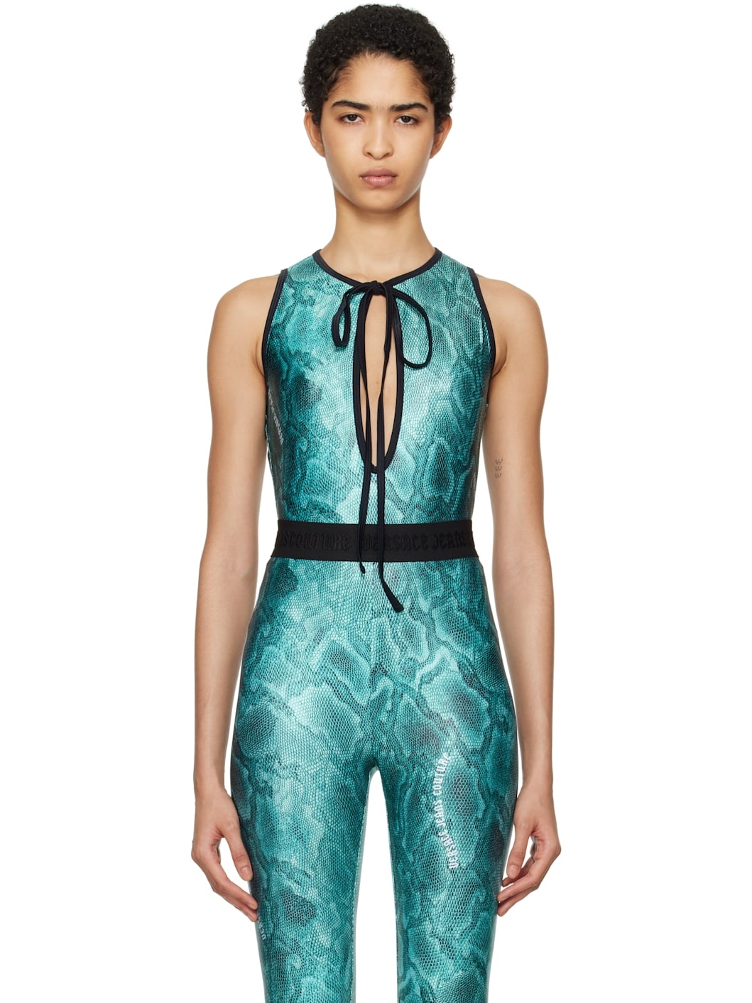 Stretch polyester jersey bodysuit. Logos and snakeskin pattern printed throughout. · Self-tie fastening at plunging V-neck · Elasticized trim at collar and armscyes · Adjustable press-stud closure at bottom Supplier color: Aqua 80% polyester, 20% elastane. Made in Italy 242202F358003