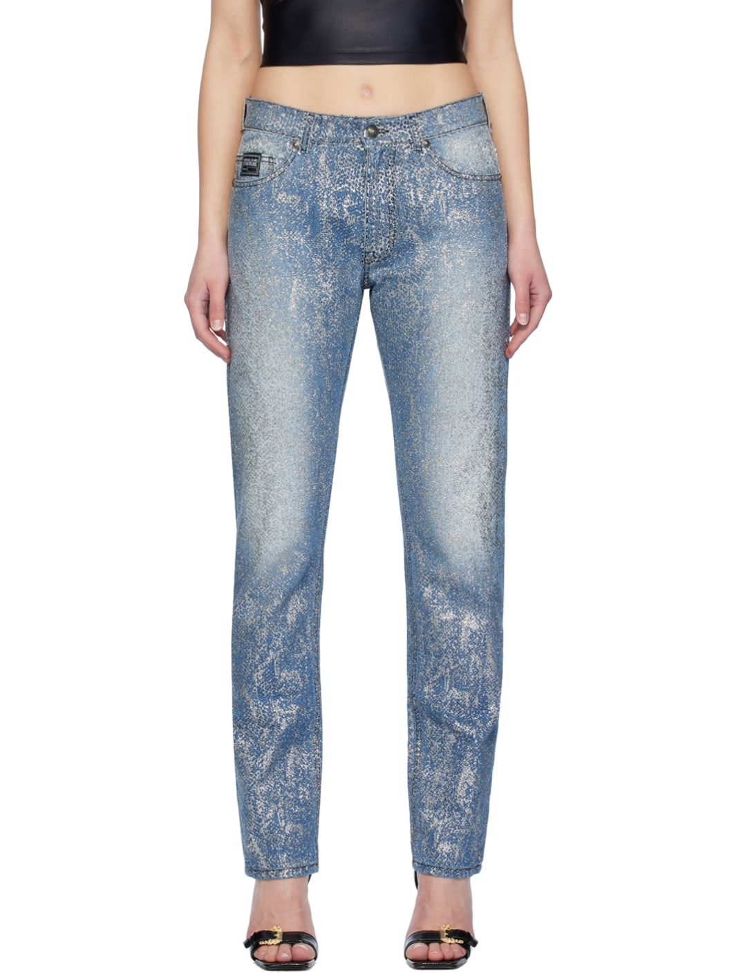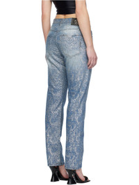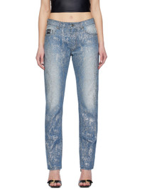 Slim-fit non-stretch denim jeans. Glittered graphic pattern throughout. · Belt loops · Five-pocket styling · Zip-fly · Logo patch at coin pocket · Leather logo patch at back waistband · Contrast stitching in navy Supplier color: Indigo Body: 100% cotton. Lining: 65% polyester, 35% cotton. Made in Italy 241202F069005
