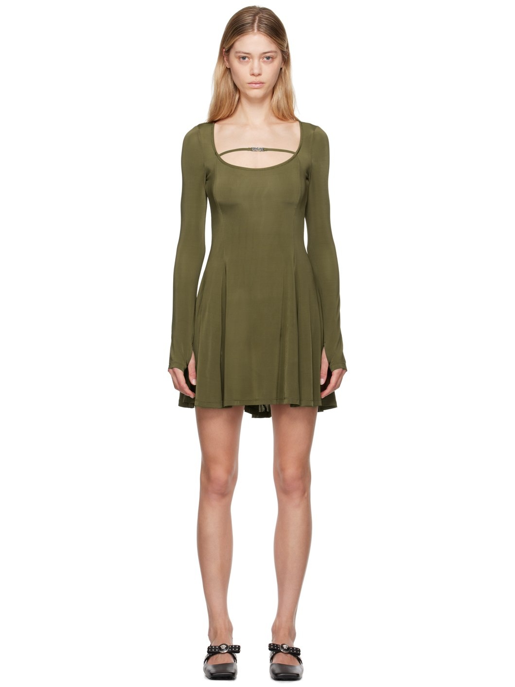 Stretch viscose jersey dress. · Scoop neck · Strap with logo hardware at chest · Princess seams at front and back · Flared hem · Thumbhole at cuffs · Fully lined Supplier color: Olive Body: 91% viscose, 9% elastane. Lining: 100% polyamide. Made in Albania 242202F052003