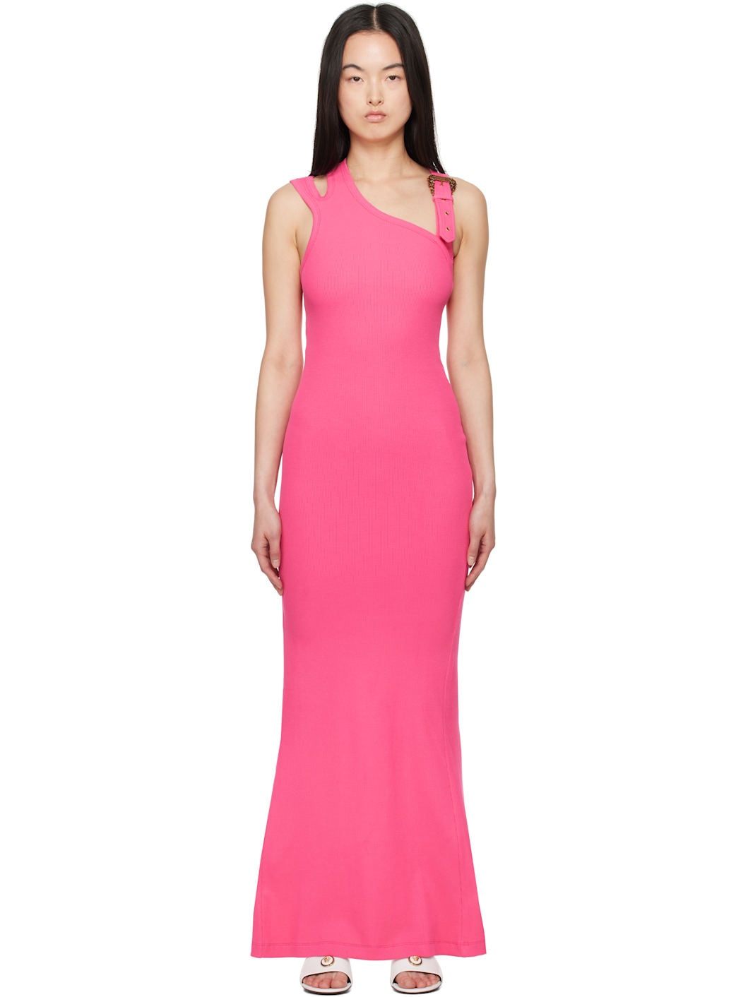 Rib-knit stretch cotton maxi dress. · Asymmetrical neckline · Pin-buckle shoulder strap · Cutout at shoulder · Slit at back hem · Logo-engraved antiqued gold-tone hardware Supplier color: Flamingo 98% cotton, 2% elastane. Made in Albania 251202F055002