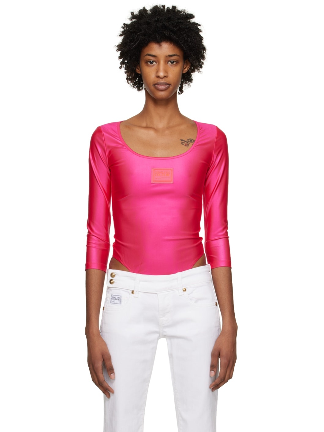 Stretch nylon jersey bodysuit. · Boat neck · Logo patch at chest · Adjustable hook-eye fastening at bottom Supplier color: Hot Pink 79% polyamide, 21% elastane. Made in Albania 231202F358001