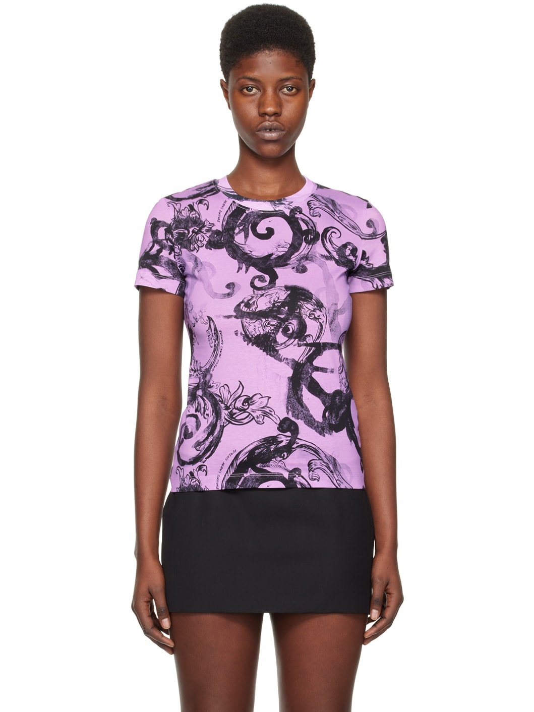 Cotton jersey T-shirt. · Logo and graphic pattern printed throughout · Rib knit crewneck Supplier color: Lilac 100% cotton. Made in Albania 241202F110004