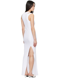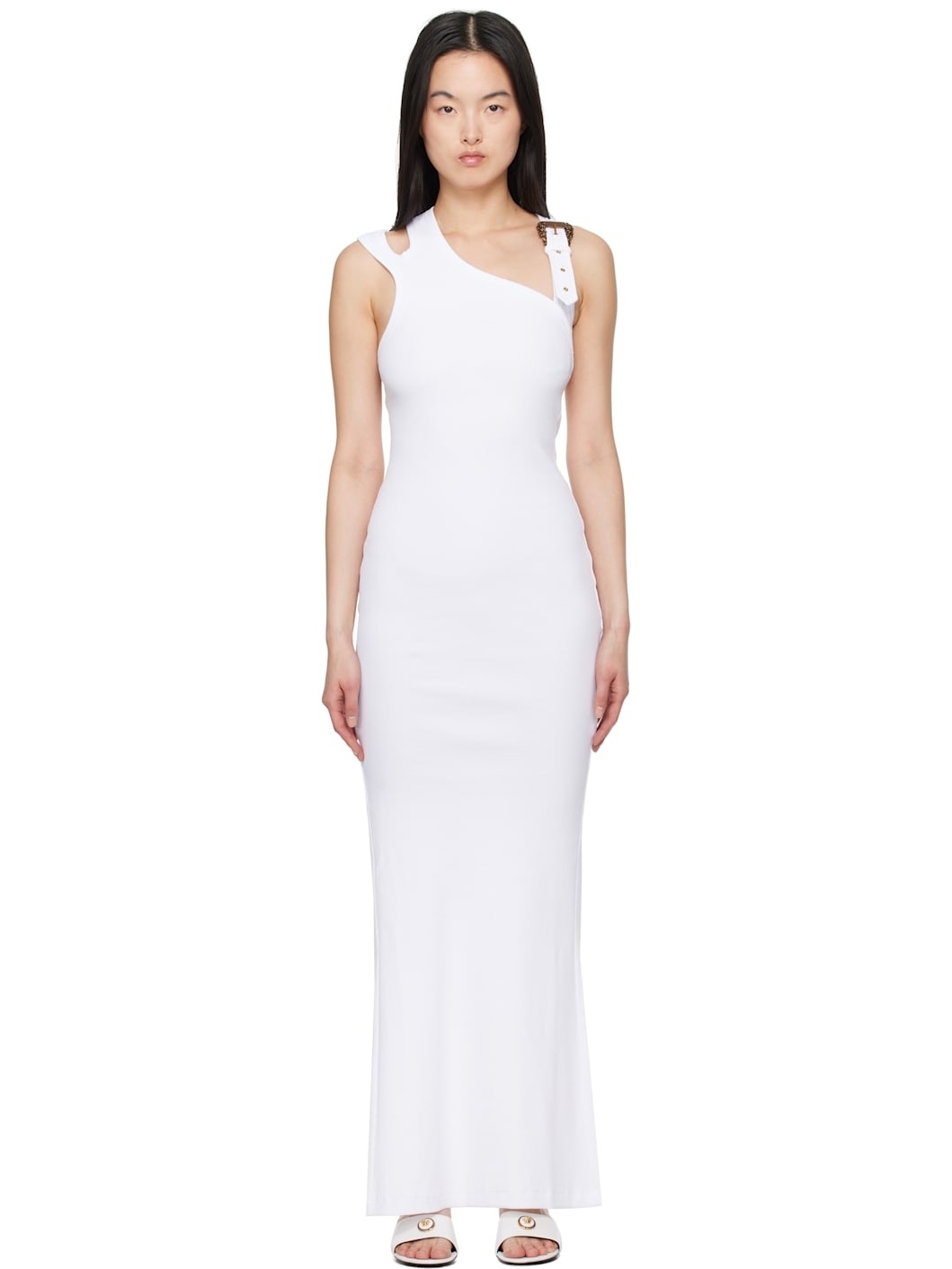 Rib-knit stretch cotton maxi dress. · Asymmetrical neckline · Pin-buckle shoulder strap · Cutout at shoulder · Slit at back hem · Logo-engraved antiqued gold-tone hardware Supplier color: White/Print 98% cotton, 2% elastane. Made in Albania 251202F055000