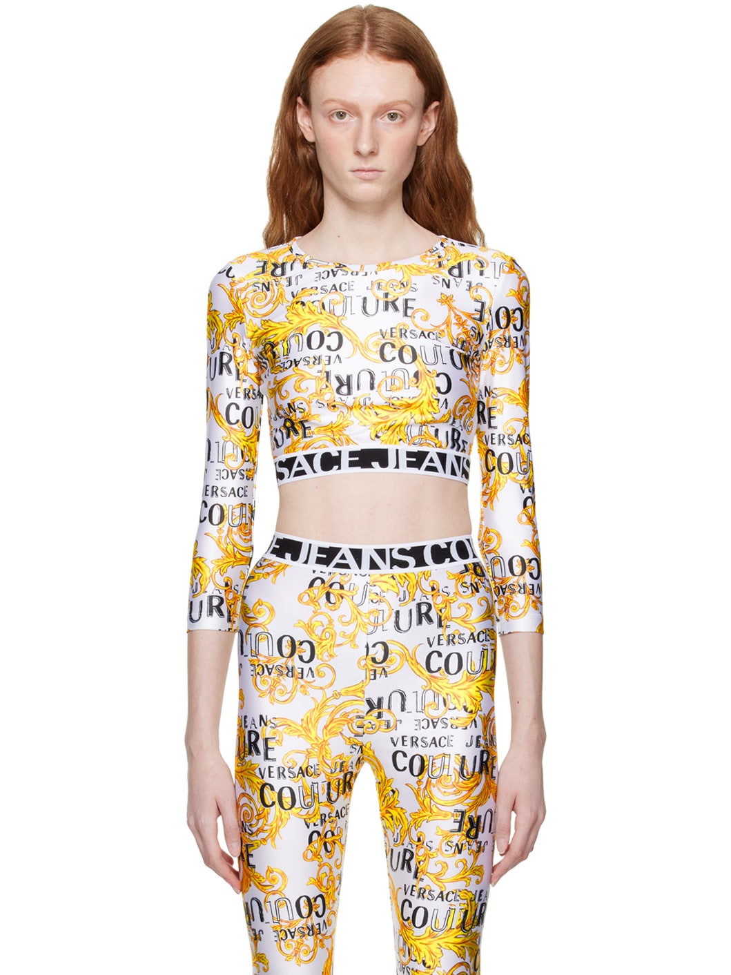 Stretch polyester jersey T-shirt. Logo graphic pattern throughout. · Scoop neck · Jacquard logo at elasticized hem Supplier color: White/Gold 80% polyester, 20% elastane. Made in Albania 231202F110036