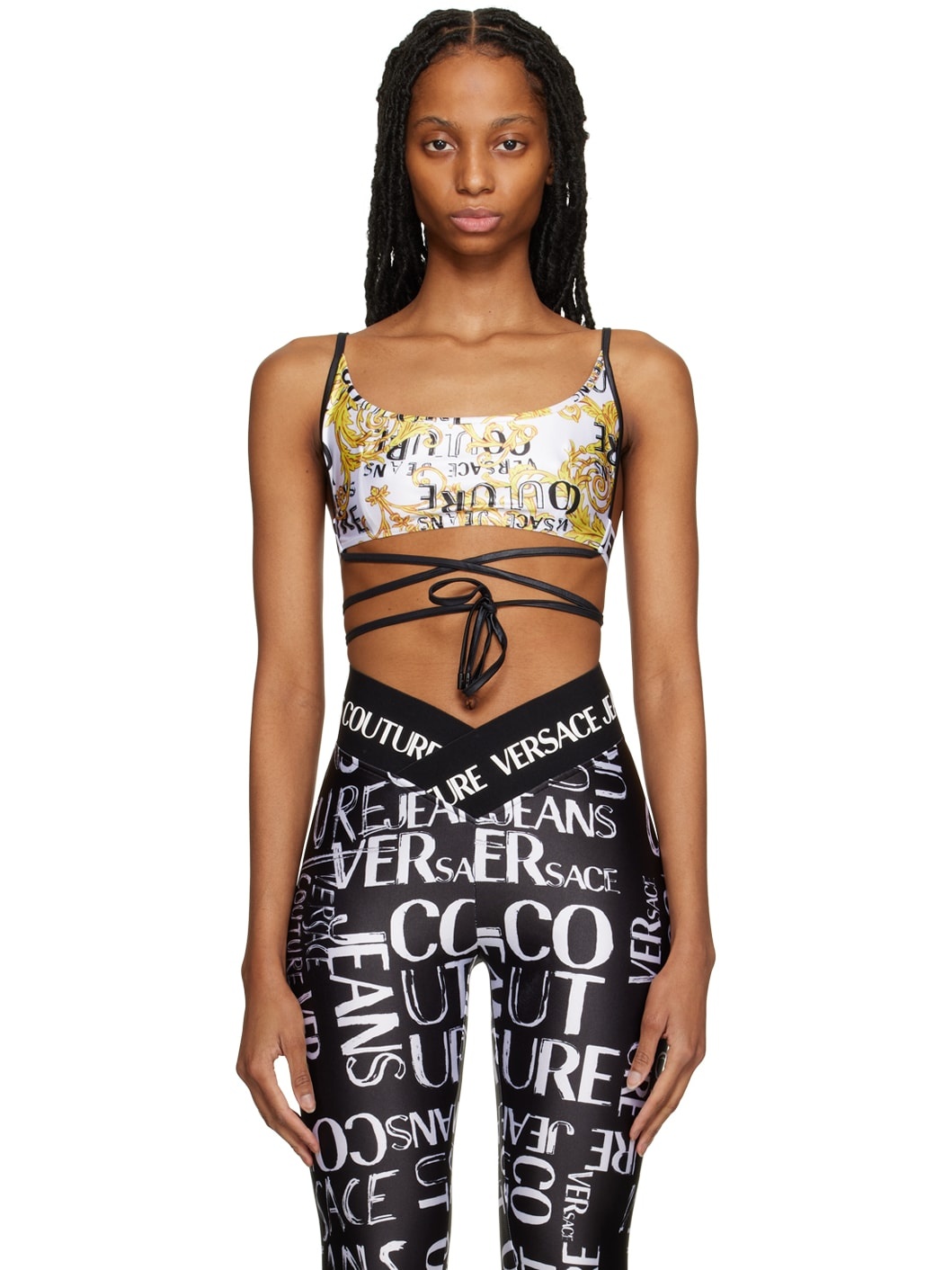 Stretch polyester jersey tank top. Logo graphic pattern printed throughout. · Scoop neck · Logo-woven elasticized cropped hem · Fixed spaghetti straps · Self-tie fastening at back · Fully lined Supplier color: White/Gold 80% polyester, 20% elastane. Made in Italy 231202F111017