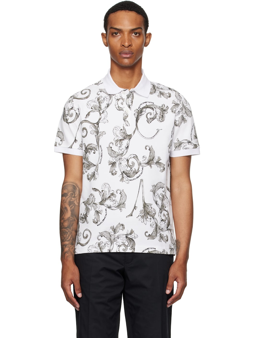 Cotton pique polo. · Barocco pattern printed throughout · Rib-knit spread collar and cuffs · Three-button placket · Tennis-tail hem Supplier color: White Body: 100% cotton. Trim: 87% polyester, 11% polyamide, 2% elastane. Made in Turkey 251202M212027