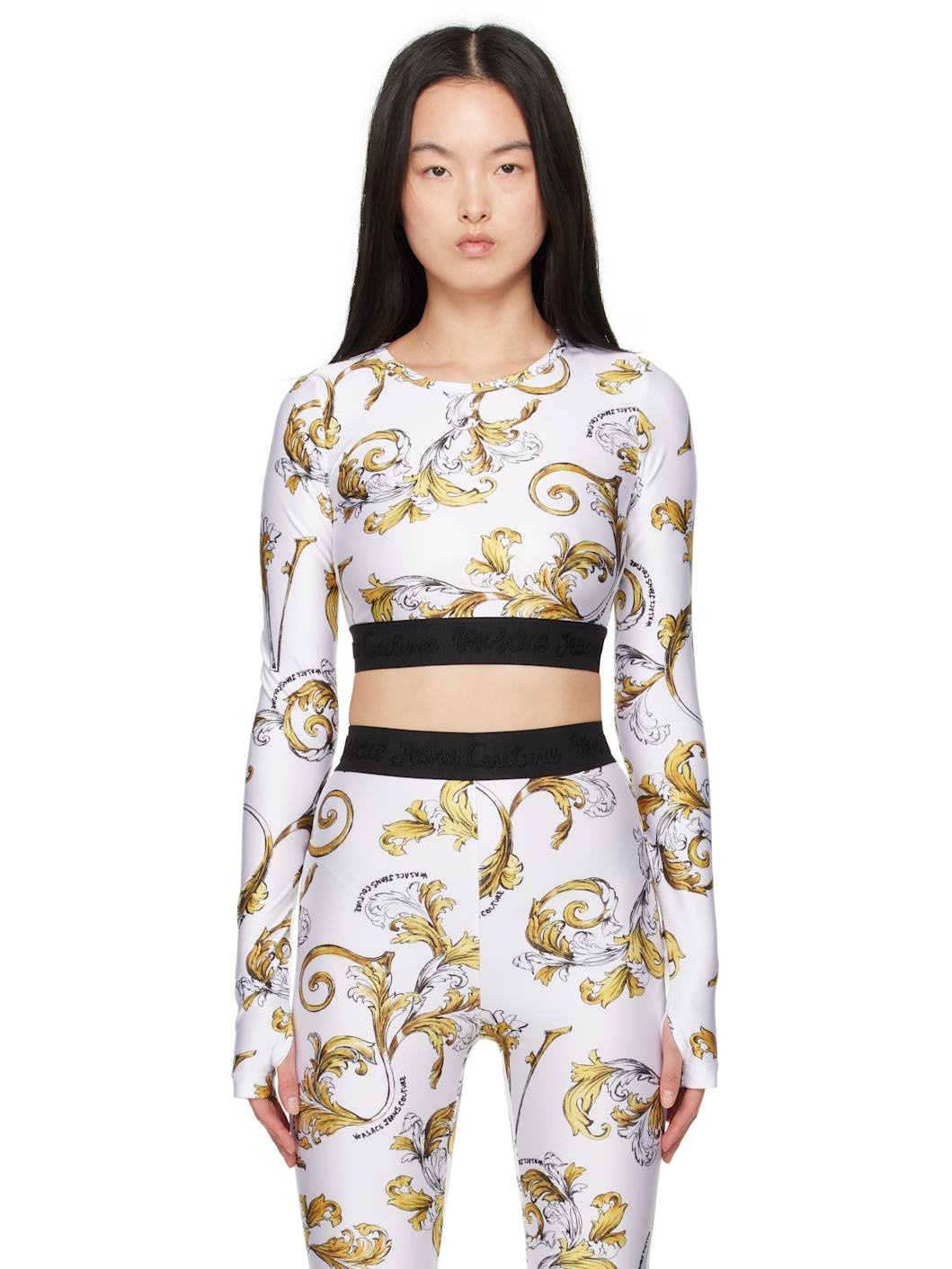 Stretch nylon jersey T-shirt. Graphic pattern and logos printed throughout. · Crewneck · Logo-woven elasticized cropped hem · Thumbhole at cuffs Supplier color: White/Gold 80% polyamide, 20% elastane. Made in Albania 251202F110000