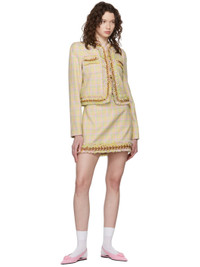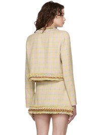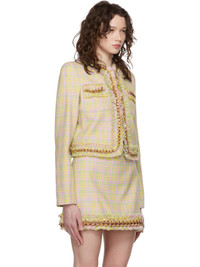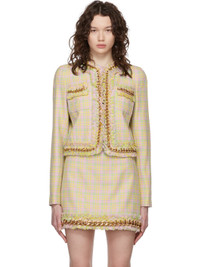 Long sleeve cotton-blend tweed jacket in multicolor. Metallic thread detailing, frayed edges, and curb chain hardware throughout. · Scoop neck collar · Hook-eye closure · Patch pockets at chest · Padded shoulders · Silk-blend crepe lining Supplier color: Yellow/Multicolor Body: 51% cotton, 38% viscose, 6% metallised polyester, 5% polyamide. Lining: 75% acetate, 25% silk. Made in Italy 221404F063001