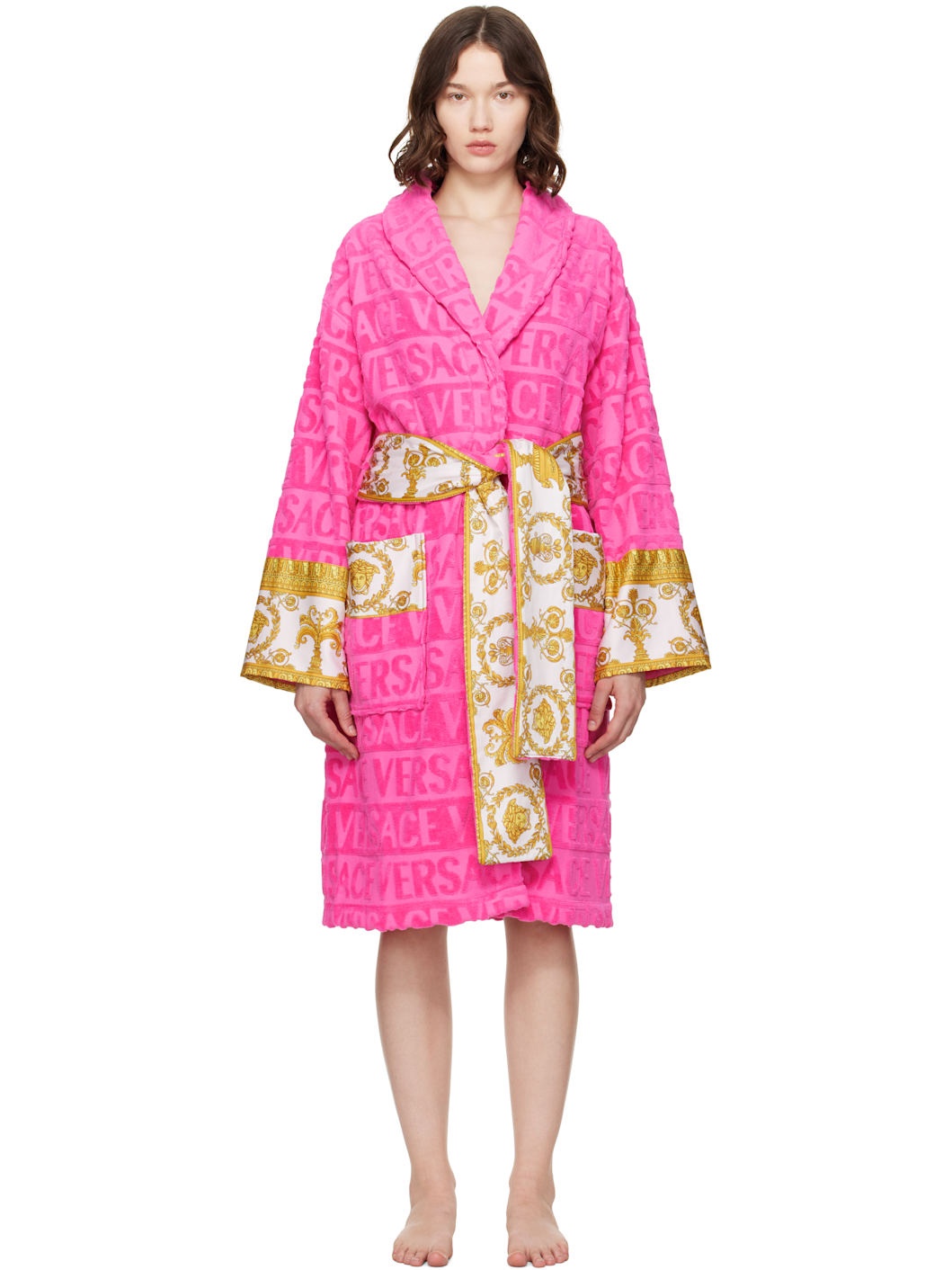 Cotton terrycloth bathrobe. Jacquard logo pattern and Barocco-patterned poplin trim throughout. · Shawl collar · Belt loops with detachable self-tie belt · Patch pockets at waist Supplier color: Pink 100% cotton. Made in Italy 252404F077006