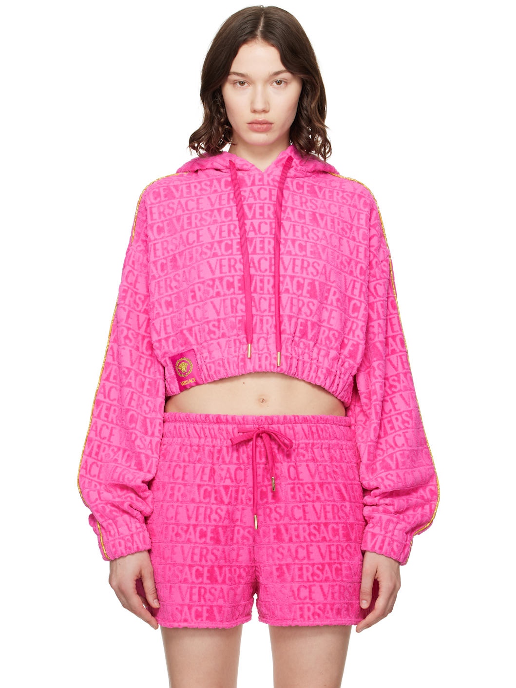 Cotton terrycloth hoodie. Jacquard logo pattern throughout. · Drawstring at hood · Logo patch at front hem · Cropped hem · Elasticized hem and cuffs · Dropped shoulders · Barocco-patterned piping at sleeves Supplier color: Pink 100% cotton. Made in Italy 252404F097000