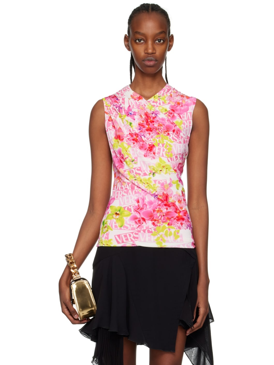 Stretch viscose twill tank top. Gathering and printed logo graphic pattern throughout. · Wrap construction · V-neck · Concealed zip closure at back · Full viscose twill lining Supplier color: White/Pink Body: 92% viscose, 8% elastane. Lining: 100% viscose. Made in Italy 231404F111001