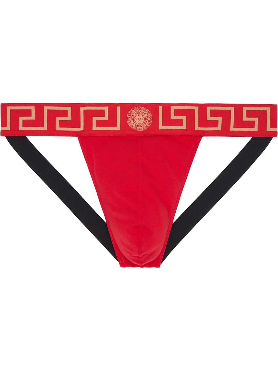 Stretch cotton jersey jockstrap. Medusa and Greek key at elasticized waistband. Supplier color: Red Body: 96% cotton, 4% elastane. Trim: 82% polyester, 9% polyamide, 9% elastane. Made in Bosnia And Herzegowina 261404M217004