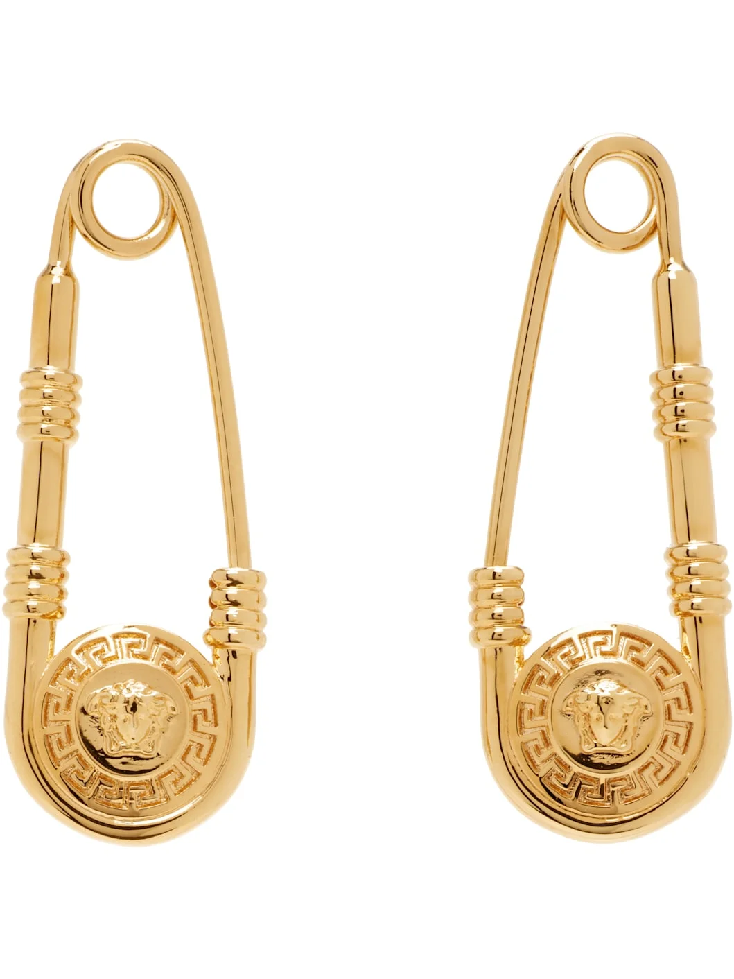 Pain of drop earrings in gold-tone brass. · Signature Medusa and Greek key pattern at drop · Safety-pin fastening · H1.25" x W0.5" Supplier color: Light gold Brass. Made in Italy 261404F022008