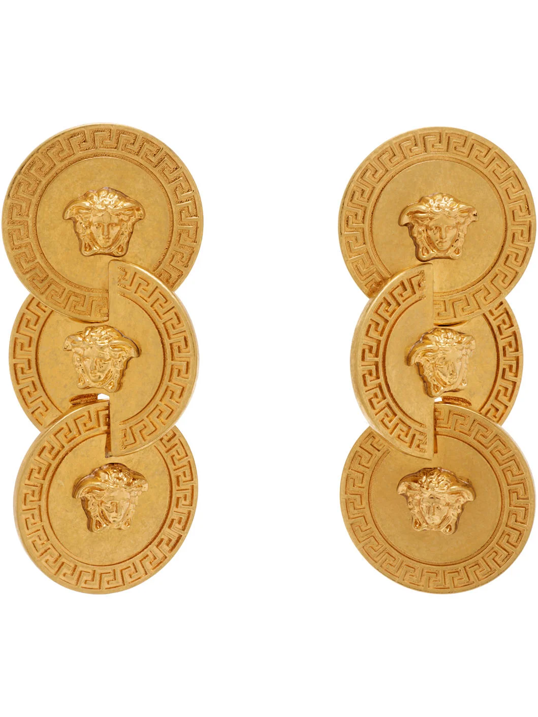 Pair of drop earrings in antiqued gold-tone brass. · Medusas and Greek key pattern at face · Logo engraved at back face · Post-stud fastening · H2" x W0.75" Supplier color: Tribute gold Brass. Made in Italy 261404F022003